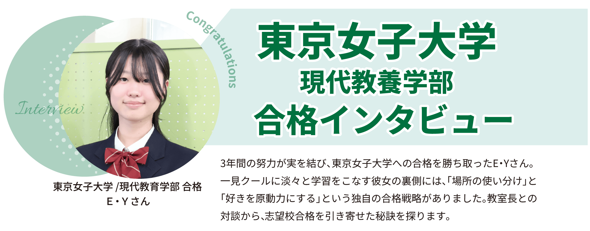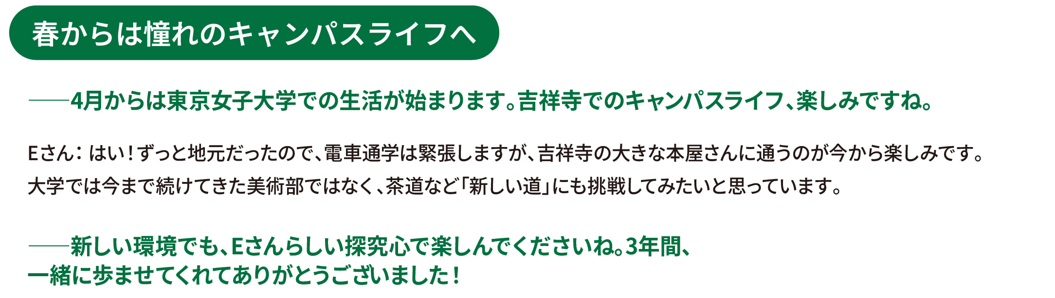 Eさん: はい!ずっと地元だったので、電車通学は緊張しますが、吉祥寺の大きな本屋さんに通うのが今から楽しみです。 大学では今まで続けてきた美術部ではなく、茶道など「新しい道」にも挑戦してみたいと思っています。 ――新しい環境でも、Eさんらしい探究心で楽しんでくださいね。3年間、 一緒に歩ませてくれてありがとうございました!