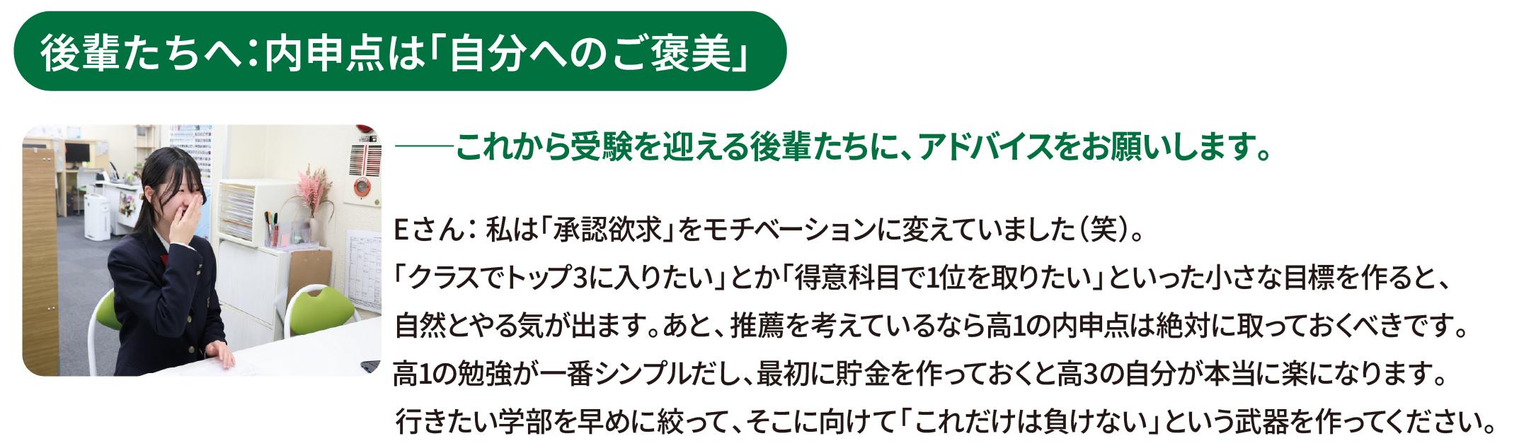 ――3年間、部活と両立しながらコツコツ積み上げてきた結果ですね。Eさんにとって、この塾はどんな場所でしたか?