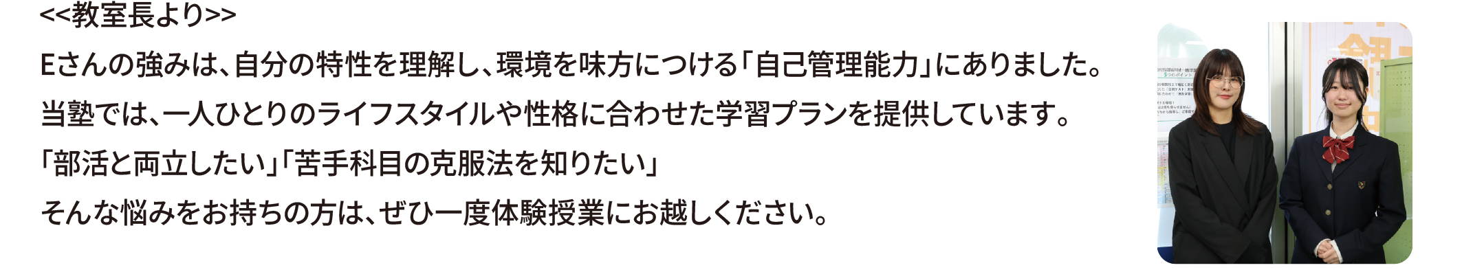 Eさんの強みは、自分の特性を理解し、環境を味方につける「自己管理能力」にありました。当塾では、一人ひとりのライフスタイルや性格に合わせた学習プランを提供しています。「部活と両立したい」「苦手科目の克服法を知りたい」そんな悩みをお持ちの方は、ぜひ一度体験授業にお越しください。
